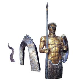 I would say the same applies to an even greater degree to the memorial composition of Cecrops, where the creation of myths in the heavenly co-ordinates of inspiration over-rides the holiness of the Athenian past. The shape of the earthly hero who allowed the Athenians to be proud of their Attic origins emerges from the Attic soil with his swirling, coiling snake's tail, like something from the well known representations of classical antiquity. In contrast to the Kodros Painter's superb portrayal of the same form on his famous kylix in Berlin, and in contrast to the Cecrops on the Kassel Krater, Natalia Mela envisions the shining maturity of a handsome, strong man who holds the spear and the shield, referring conceptually to the guaranteed protection of his native land. The expressive character and the strength of his facial features, the imagined accentuation of his muscles, the magical play of light and shade on the scaled section of the body leave not a margin of doubt about the symbolic aim of its creator. Nor is there any doubt about the range of the work's symbolic aims which mobilise the mechanics of coherent conversion from past to present struggles to protect this land.