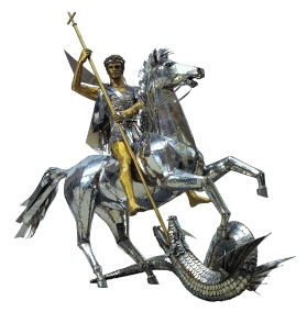 The reconciliatory mood guides its inspirations and balances the contrary currents of emotional expression and cold intellectual reckoning; it is a fleeting spirit and an expressive restraint, memories of a life intensely lived and the fantastic vision hoped for, the youthfulness of moments that are etched in our consciousness, the maturity obtained from the tensions of being set free. Her forms are like something that soothes the soul, they seem like fairy tales, as if they have gained substance from those old narratives, the stories grandmothers told and the heroic feats in the folk-stories that filled our youths full of feeling. This certainly applies to St George and the Dragon, which is something more than the clever, well-balanced composition of volumes, a comprehensively studied group of lines and planes. The form of St George, coming from on high, 'flying' on his horse between the sky and the earth, recalls the heroic dimension of the rebellious mood of the Greeks, the crystallisation that resulted from centuries under Turkish rule and the enlivening intervention of the Orthodox Church as the guarantor of the victory of good. Inside the somewhat geometric, cube-like organization of its components, we see projected the model of manliness, spiritual, bodily and ethical power that the suffering Greeks have always dreamed of. Without sentimentality and without folkloric pangs of remorse, this work of art makes a bitter but rational comment with its obvious digs at the durability of symbols today.
