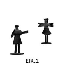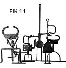 By contrast, elegance, charm, the lithe movement of a 'Young Woman' (plate no. 7) is apparent in the twisted throat/stalk of an iron spatula as well as in the figure of the 'Girl' (plate no. 8) where a unique spatula or trimmer, despite its abstract character, manages to convey something of the naivety and the latent sexuality of that unripe age. The 'Three Graces' (plate no. 9), looking like the two-dimensional versions of Boetian bell-shaped clay figures, bring back to mind the black figures of Geometric pottery. Nata assures me that these references are completely conscious, as is the mythological origin of a considerable number of figures she has constructed.