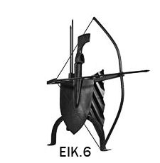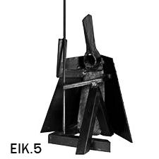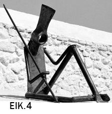 For the construction of the 'Sentries' (plates no. 4, 5) she has used a double-ended hoe. One end of the digging tool represents the body, the breast of the warrior, while the other end is a small axe used in cutting roots. In between lies the iron ring by which the wooden handle is attached to the tool. The ring and axe make up the head/helmet and the helmet's crest. Any similarity of the axe to a head/warrior arises, of course, from the power of metaphor. Hector in the Iliad is characterized as «êïñõèáßïëïò», he, who carries a shining and multicolored crest on his head, a symbol of murderous impulse aimed at scaring the enemy. In Nata's warriors the crest is made of the blade of the axe. The involvement of functional objects in the production process of a work of art raises them from the simple, functional plane to that of associational poetry. This visual metaphor reaches the peak of its potential in the 'Archer' (plate no. 6). The head/helmet is composed of an axe used for splitting wood. The axe's particular shape – angles, cutting edge, curves – gives the feeling of a murderous tool. The entire 'Warrior' is a murderous tool: the pointed shape of the shovel/body/shield, the inflexible and wavy sheet of metal, the cloak, the wire/bowstring, the nails/arrows, all together compose an all over edgy and thorny figure. At the same time, comparison with the representation of warriors in the Attic Geometric pottery of the 8th century BC is inevitable. There also, the huge shield, the Homeric 'óÜêïò', covers the warrior's body; a head/helmet stands out above, two lean legs below and the spears at the side. Black figures on the curved, ochre surface try hard to come alive. Nata's sculpted figures, also black, move in space; they have acquired life; occasionally they also express emotions like the melancholy of the 'Sentry' (plates no. 4, 5). I have noted down the following brief abstracts from a conversation with Nata about the colour of her iron sculptures, «I have always respected the material... iron must be iron... Aris used to say that all iron should be painted black or in the typical red undercoat (ìßíéï)... iron for me is a weapon... a weapon must always be kept clean». Indeed, black may be the 'natural' colour of iron or the habitual, the necessary and operational one, but colours have their own symbolic language which travels through time, and which is historically and culturally determined. In the Homeric poems, the great majority of colour references concern «ìÝëáí» (black) and «ëåõêüí» (white). Light and dark, pitch darkness; life and its opposite. Night is «êåëáéíÞ», «ìÝëáéíá», «åñåâåííÞ»; the earth is also «ìÝëáéíá»; death is «ìÝëáò»; and so is Hades; blood is «ìÝëáí» and «êåëáéíüí». Nata says that she has always wanted to make Charon and Digenis. I don't know about Digenis, but this 'Warrior', this black, stiff, faceless figure, wrapped in night, how much more like Charon can he be? (plate no. 2)